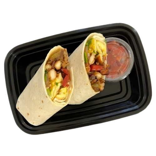 By popular demand, we created this new breakfast meal. Wrapped in a flour tortilla are all the goodness of grilled chicken asada, roasted red potatoes, bell peppers, onions, whole eggs, and cheese. Served with a side of salsa.