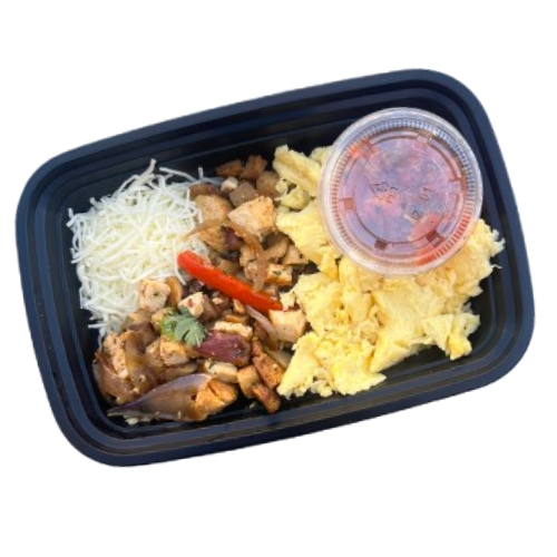 By popular demand, we created this new breakfast meal. This low-carb, gluten-free breakfast meal consists of grilled chicken asada, roasted red potatoes, bell peppers, onions, scrambled whole eggs, and cheese. Served with a side of salsa.