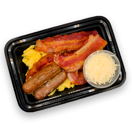 Our Keto Breakfast features 3 Scrambled Eggs, Sweet Italian Chicken Sausage, Hearty Bacon and a side of Shredded Cheese.